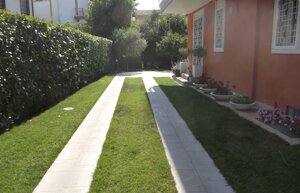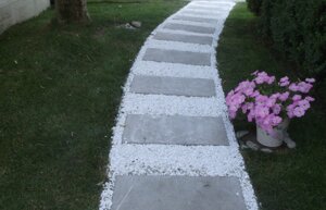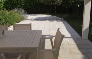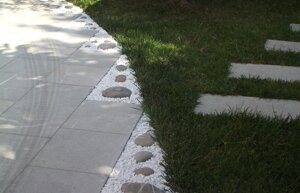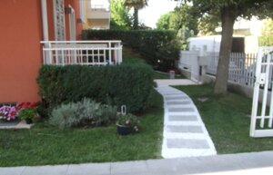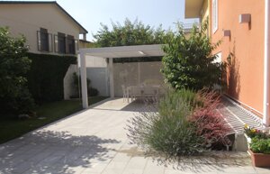 Pergola in metallo e tessuto - Recinzione in metallo - Pavimentazione - Area verde